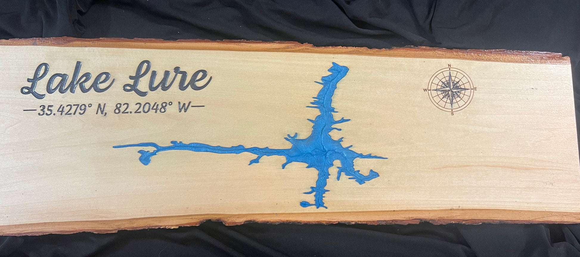 Full size lake boards are on live edge planks that measure 23" x 7-9". The lake name, body of water, longitude and latitude, and parts of the compass are filled with pigmented epoxy resin. The color of the epoxy may vary. Each board is different and may have different knots and colors throughout.