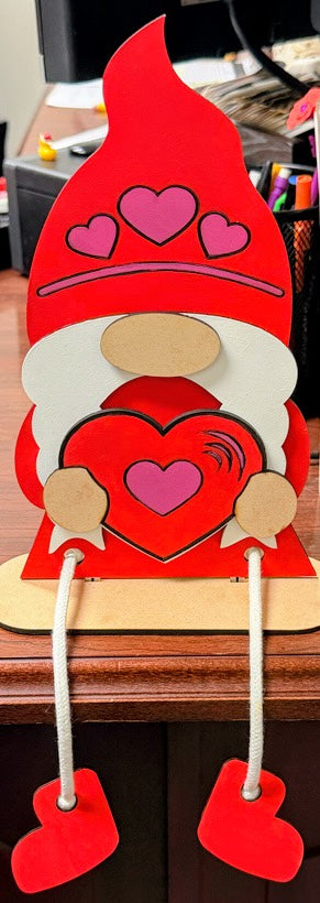 This is a small painted gnome. The ribbon legs are attached to the wooden feet.